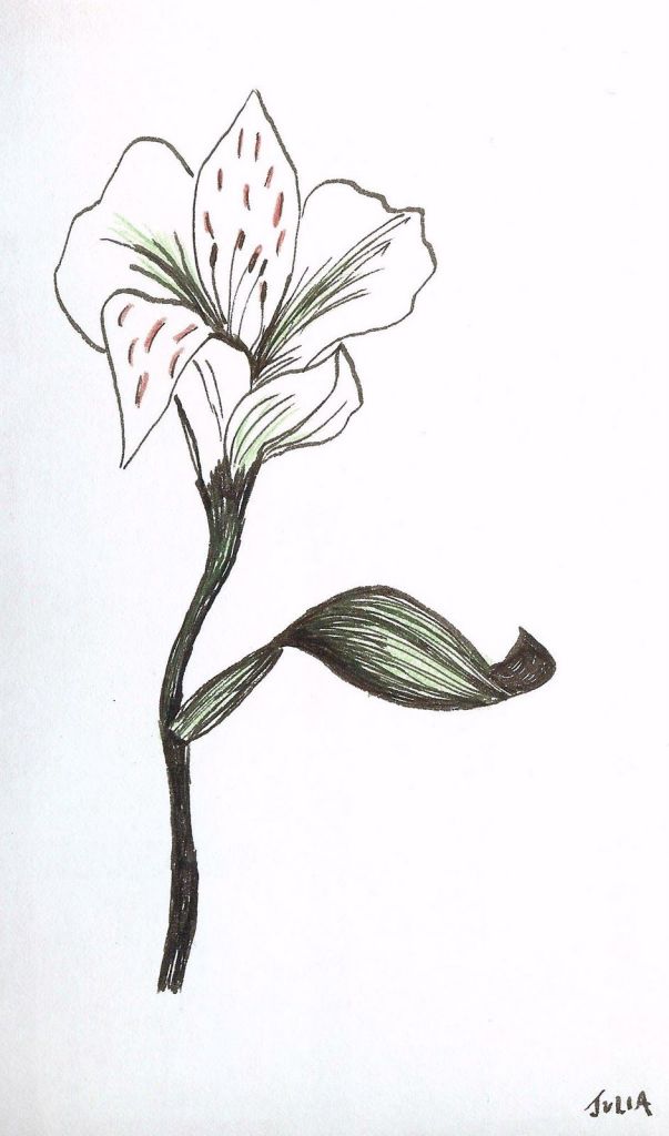 Materials: cut flowers (2 or 3), black ink, drawing nib and holder (or any black pen for drawing), bamboo brush (small), chalk pastels, sketchbook or other kind of drawing paper 11 x 14″