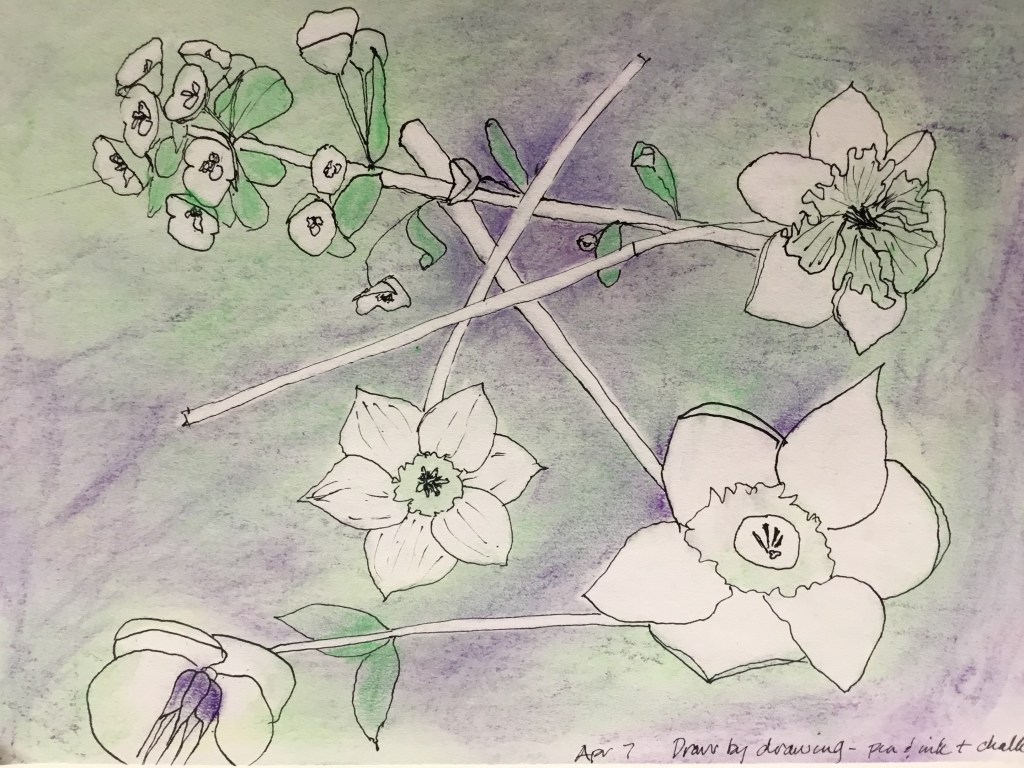 The focus of this Draw by Drawing session will be flower drawing with pen and brush and using chalk pastels for background.
