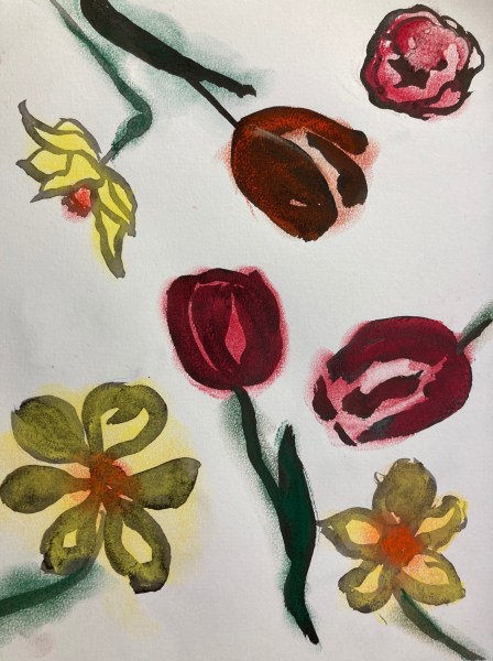 Materials needed: black ink, brush (#10 watercolour brush or small bamboo brush), two small containers half full with water, chalk or soft pastels (2 colours is enough), soft cloth for blending, 2-3 cut flowers (buy yourself some flowers or use flowers from the garden)